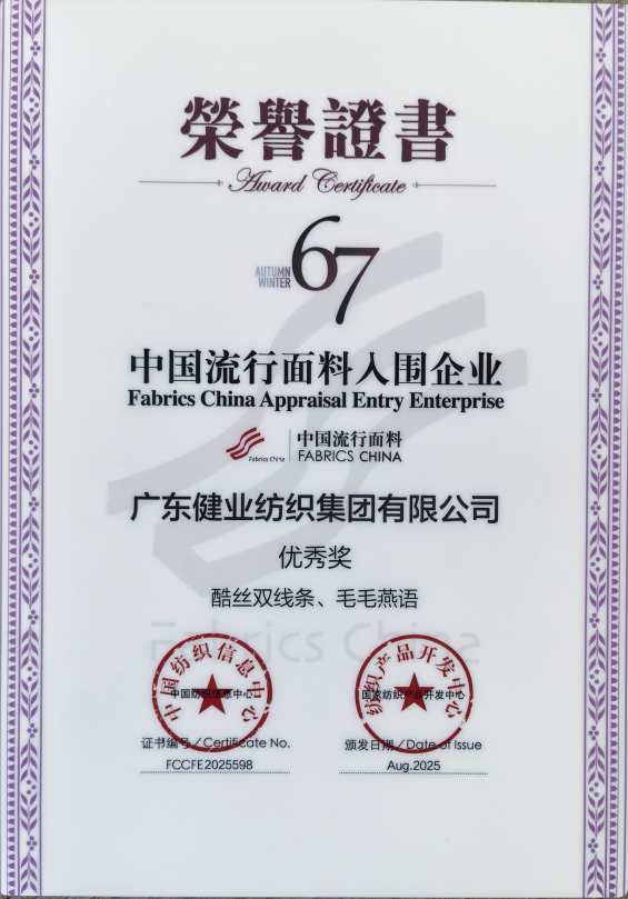 健业纺织集团凭创新产品荣获“中国流行面料入围企业“
