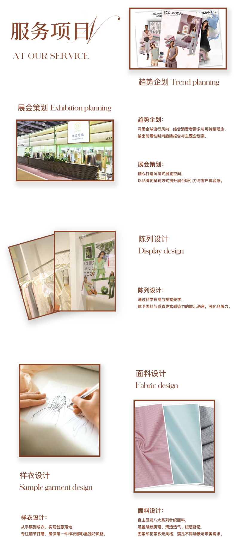我们以“设计赋能”为核心理念,构建了涵盖 趋势企划、展会策划、陈列设计、样衣设计、面料设计五大维度的完整服务体系。每一环节皆融合前沿视野与精湛工艺,助力品牌精准把握市场脉搏,打造兼具美感与功能性的时尚产品。